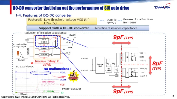 The 1DD series is a dedicated DC-DC Converter for driving various SiC and IGBT power modules. The low parasitic capacitance (12pF) and Insulation voltage (10.8kV) make this product ideal for driving SiC and IGBT power modules.