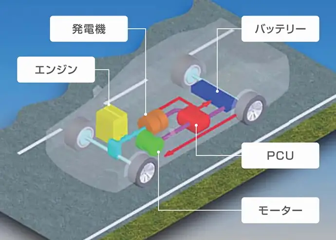 - Electric power generated by the engine is stepped down and the battery is charged.